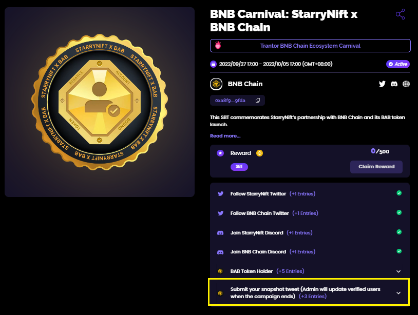 Once you have completed the quest, your address will be recorded and uploaded into our backend system! **You will be able to verify your completion after the campaign ends**!